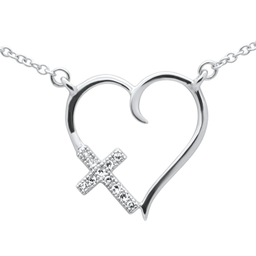 .03ct G SI 14K White Gold Diamond Heart With Cross Pendant Necklace 18" Long