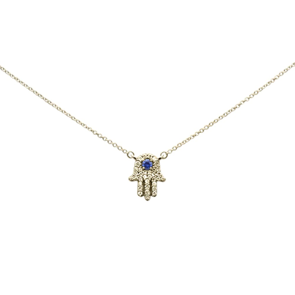 .31ct G SI 14K Yellow Gold Diamond & Blue Sapphire Hamsa Pendant Necklace 18" Long Chain