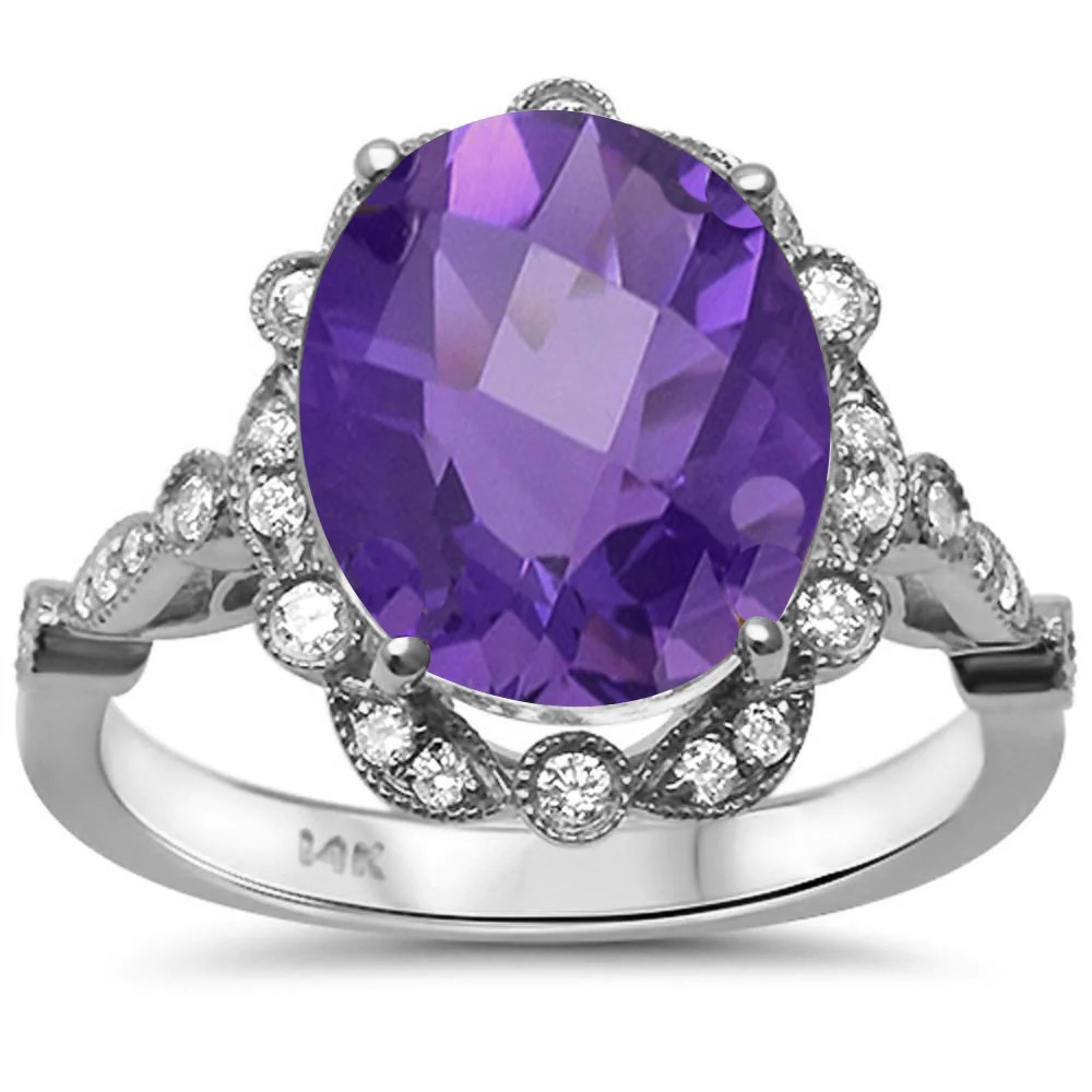 3.29cts Oval Amethyst Gemstone & Diamond 14k White Gold Ring Size 6.5