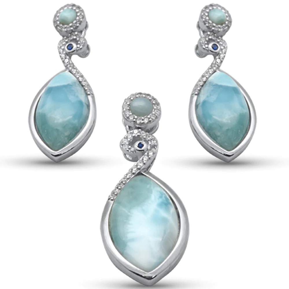 • Natural Larimar, CZ & Blue Sapphire .925 Sterling Silver Earring & Pendant Set
