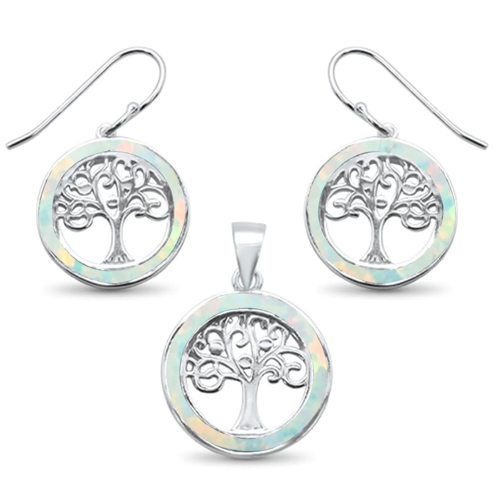 White Opal Tree Of Life .925 Sterling Silver Earrings & Pendant Set