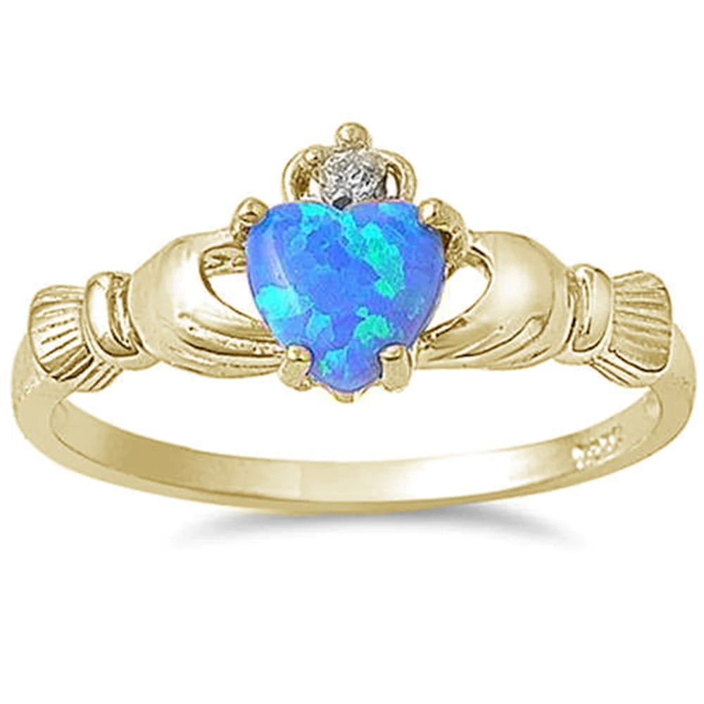 • Yellow Gold Plated Blue Opal Claddagh .925 Sterling Silver Ring Sizes 6-8