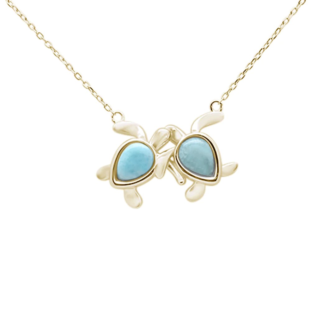 Yellow Gold Plated Natural Larimar Two Turtles Love Friendship .925 Sterling Silver Necklace 16-18"